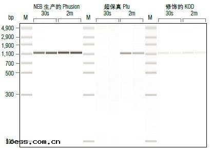 Phusion 超保(bǎo)真 DNA 聚(jù)合酶擴增片段的(de)產量更高,延(yán)伸時間(jiān)更短。使用不同的(de)聚(jù)合酶擴增一段 1.2 kb 長度的(de) C. elegans 基(jī)因(yīn)組片段。所有擴增反(fǎn)應按照廠家推薦條(tiáo)件重(zhòng)復進行(xíng)(30 個循環 、30 秒或 2 分(fèn)鐘(zhōng)的(de)延(yán)伸時間(jiān))並用微流控芯片技術(microfluidic LabChip® analysis)檢測。