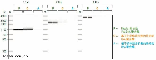 Phusion 熱啓動 Flex DNA 聚(jù)合酶具(jù)有*擴增能力 。除(chú)了(le) 1.3 kb C. elegans 擴增片段 ,其它擴增片段模(mó)板均為 human Jurkat。擴增長度如上膠圖所示。所有擴增反(fǎn)應按照廠家推薦條(tiáo)件(30 個熱循環)重(zhòng)復進行(xíng)並用微流控芯片技術(microfluidic LabChip® analysis)檢測 。